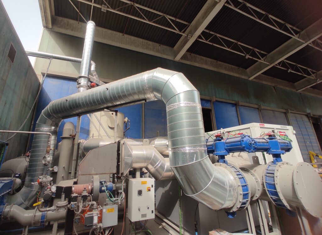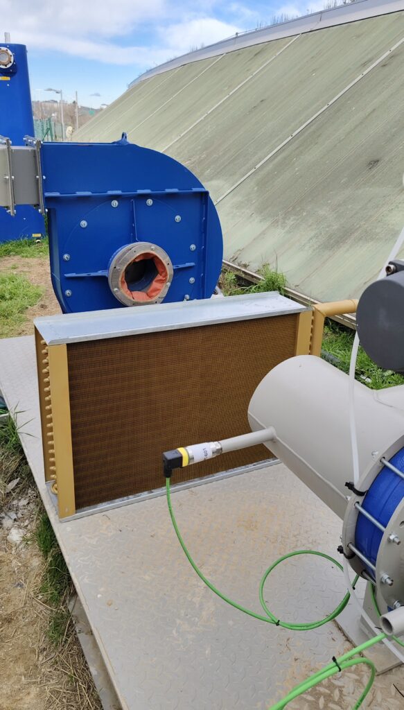 S’ha instal·lat l’intercanviador de calor, l’equip encarregat de refredar l’aire net que entra a l’hivernacle, i s’ha connectat amb el refredador adiabàtic. Aquest sistema permet refredar l’aire net tractat abans de ser injectat a l’hivernacle. El refredador adiabàtic permet refredar un corrent d’aigua que, posteriorment, es troba amb l’aire calent del pilot i, mitjançant l’intercanviador de calor, aquest aire es refreda i queda preparat per entrar a l’hivernacle.